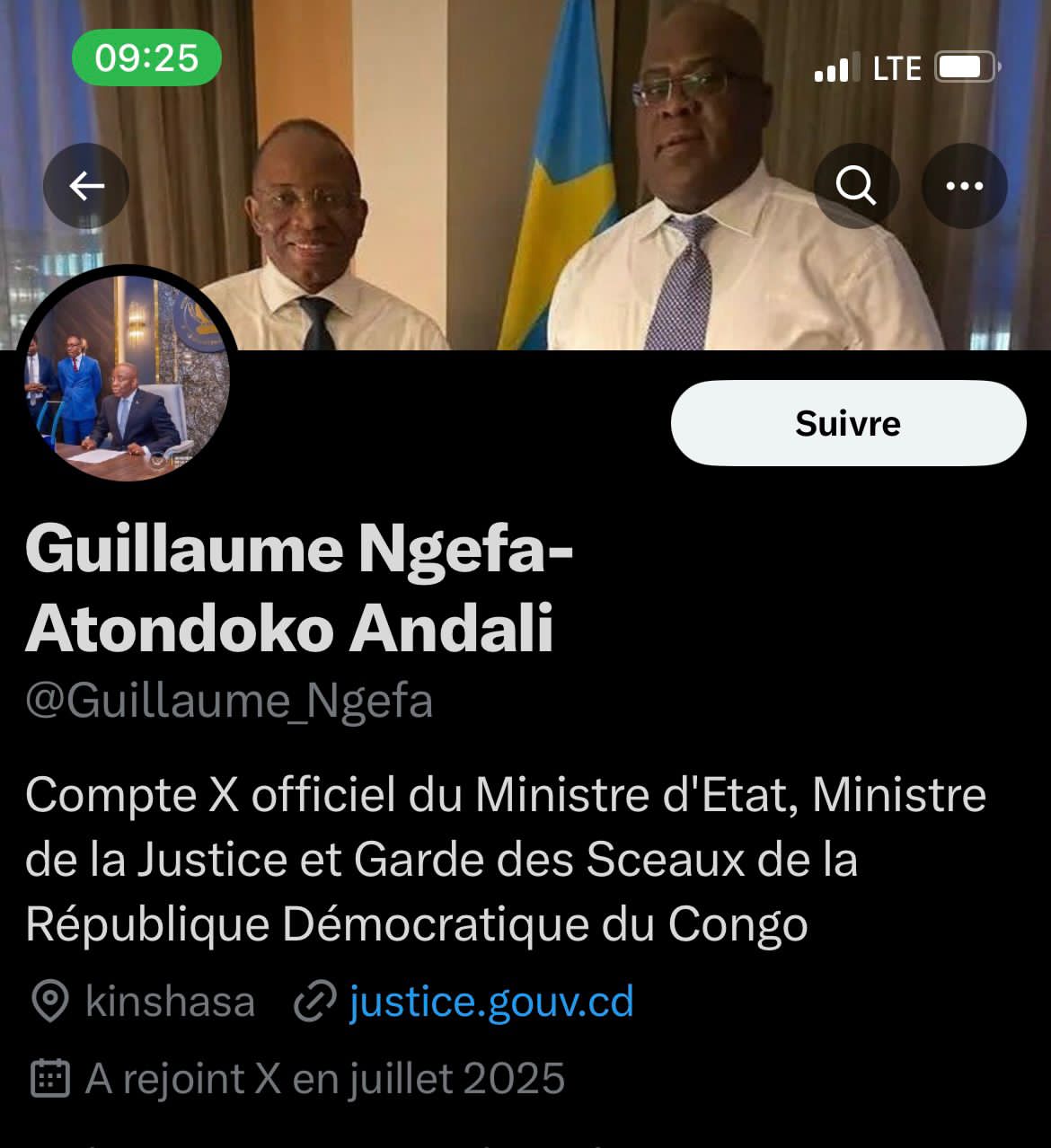 Depuis juillet 2025, un compte X (anciennement Twitter) circule sous le nom de Guillaume Ngefa-Atondoko Andali, présenté comme étant celui du nouveau ministre d’État, ministre de la Justice. Mais attention : il s’agit d’un compte frauduleux.