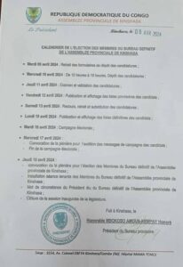 Dans un communiqué signé par le député Mbokoso Amous-Kempay Honoré, président du Bureau provisoire de l’APK, ce corps législatif de la Ville-Province de Kinshasa a rendu public, ce mardi 09 avril 2024, le calendrier de l’élection des membres de son Bureau définitif.