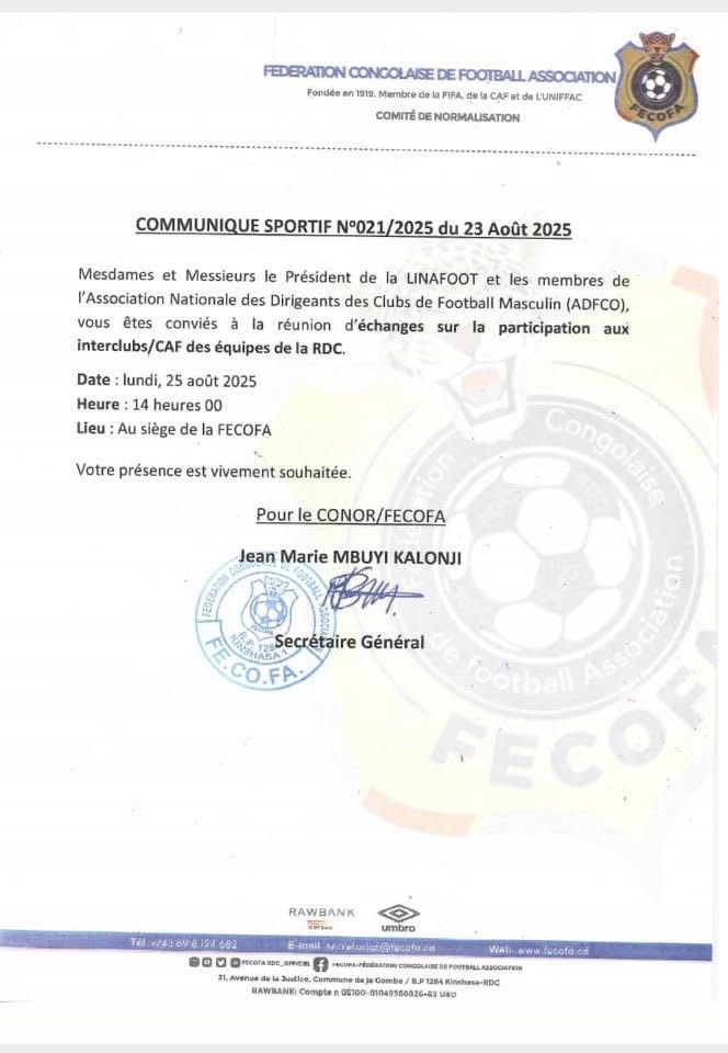 Dans un communiqué officiel daté du 23 août 2025, la Fédération Congolaise de Football Association (FECOFA) a convoqué les dirigeants de clubs membres de l’ADFCO ainsi que la LINAFOOT à une réunion d’échanges sur la participation des équipes congolaises aux compétitions interclubs de la CAF. Cette rencontre se tiendra le lundi 25 août à 14h, au siège de la FECOFA.