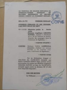 D’abord, au niveau du Tribunal de grande instance de la Gombe dont le jugement sous RC102.868 du 10 mars 2010 annule la vente du 24 octobre 2008 intervenu entre le premier locataire sous le bail emphytéose et AVC-Construct, et ordonne en même temps l’annulation du certificat établi au nom de la société AVC-Construct, pour son caractère faux. Cette décision du TGI-Gombe est exécutée par le conservateur des titres immobiliers de Mont-Ngafula. Téméraire, Jeannine Yanga ressurgit en 2011 avec une nouvelle copie du certificat pourtant annulé par la Justice, pour initier, cette fois, quelques actions judiciaires frauduleuses.