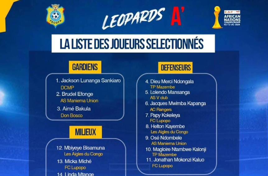 Voici la liste complète des 26 Léopards A’ retenus par le sélectionneur Otis Ngoma pour défendre les couleurs de la RDC au CHAN 2024 : les gardiens Jackson Lunanga (DCMP), Brudel Efonge (AS Maniema Union) et Aimé Bakula (CS Don Bosco) .