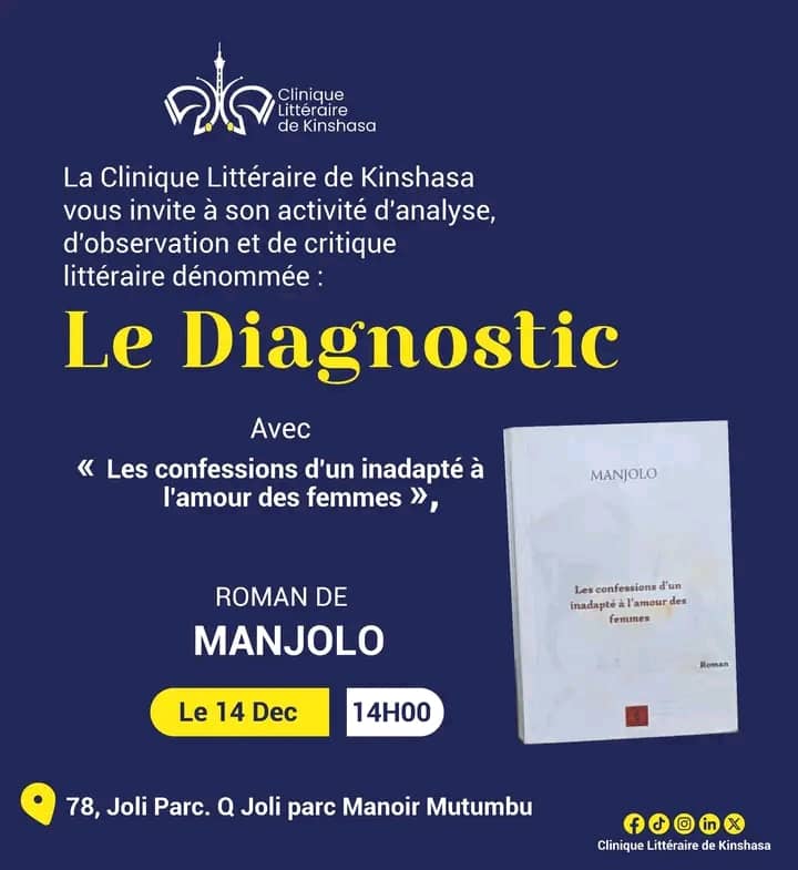 La scène littéraire kinoise s’apprête à vivre un moment de grande densité intellectuelle. Ce dimanche 14 décembre, à partir de 14h00, la Clinique Littéraire de Kinshasa tiendra une nouvelle session de son activité d’analyse et de critique baptisée « Le Diagnostic », consacrée cette fois au roman Les Confessions d’un inadapté à l’amour des femmes de l’écrivain MANJOLO.