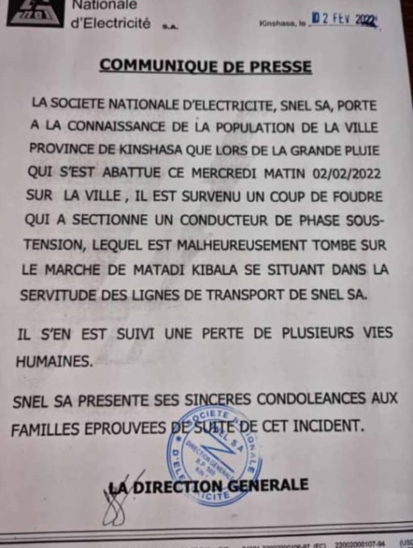 Drame de Matadi Kibala : Voici la version de la SNEL !