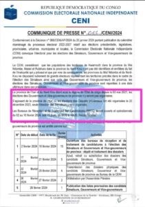 La Commission électorale nationale indépendante (CENI) a rendu public, via un communiqué Nº 011/CENI/2024, la date du début des réceptions et traitements des candidatures des sénateurs, gouverneurs et vice gouverneurs de province du 2 février au 16 février 2024. Les provinces sous état de siège ne sont pas concernés par l’organisation des ces élections.