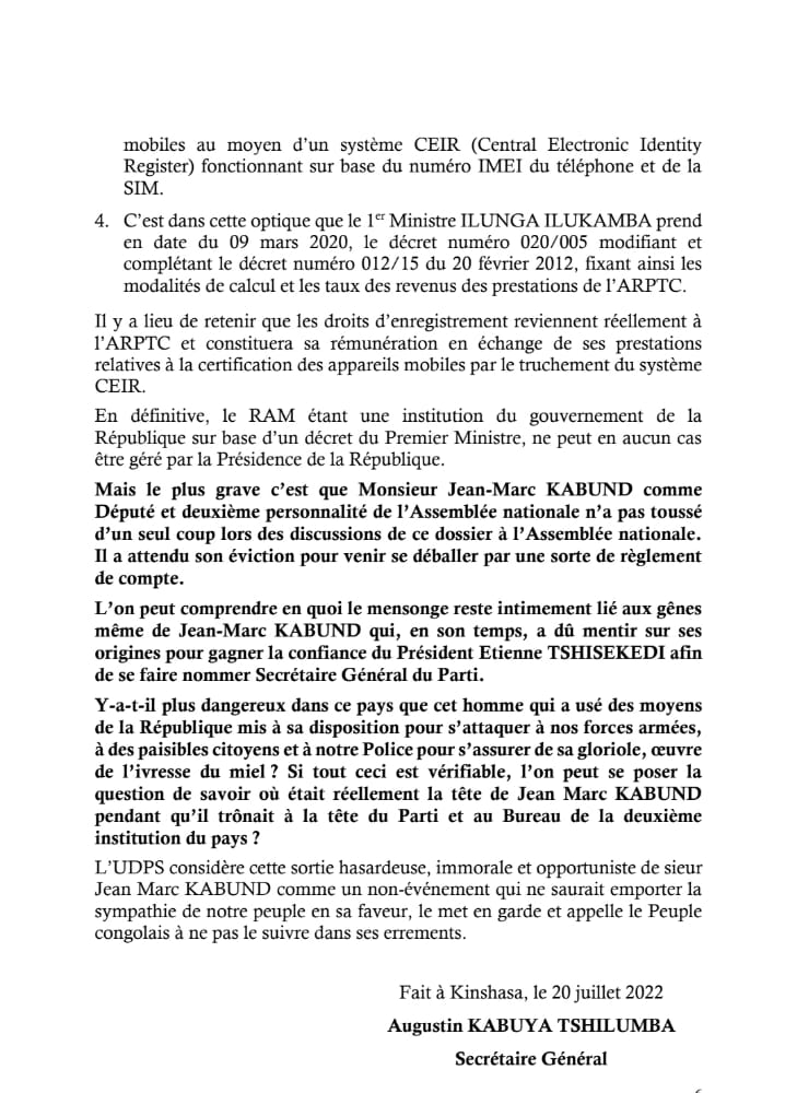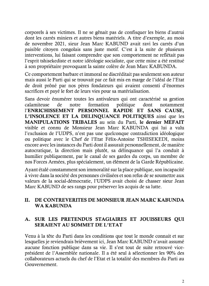 Pour ce haut cadre de l’UDPS, «Kabund est un immoral, un délinquant , un homme frustré qui confisquait les biens d’autrui dont des carrés miniers ! L’on peut comprendre en quoi le mensonge reste intimement lié aux gênes même de Jean-Marc KABUND qui, en son temps, a dû mentir sur ses origines pour gagner la confiance du Président Etienne Tshisekedi afin de se faire nommer Secrétaire Général du Parti ».