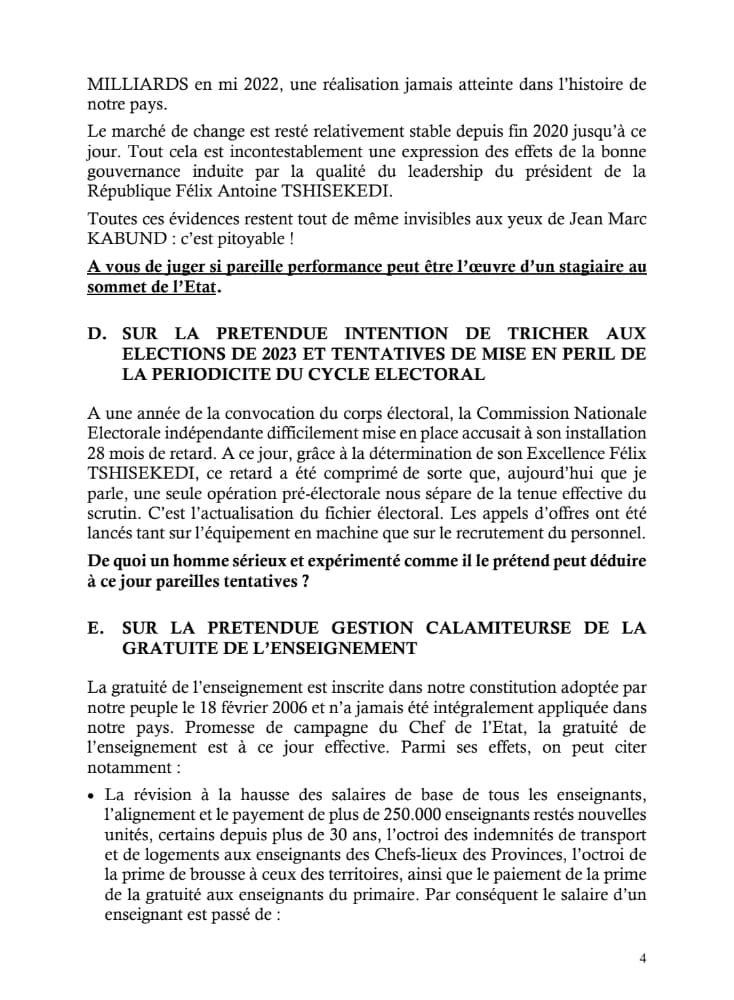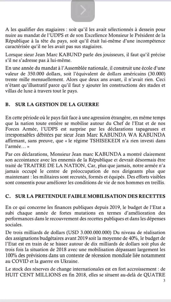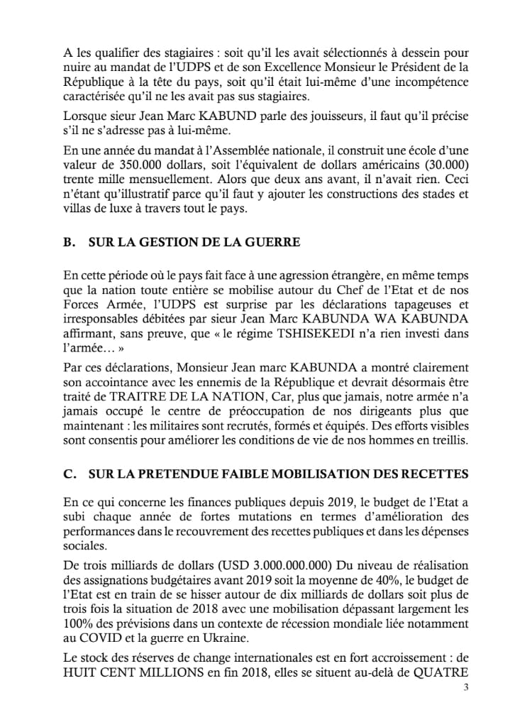 « L’appareil de l’État se détériore et devient de plus en plus un club d’amis pour les apprentis sorciers de tous bords exerçant leur stage au sommet de l’État. il faut rapidement tourner la page Félix Tshisekedi. Il est clair que monsieur Félix Tshisekedi aujourd’hui, doit être considéré comme un danger au sommet de l’État », avait déclaré JM Kabund.