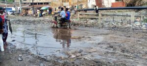 Transformée en lac d’eau artificiel depuis la fin de la saison pluvieuse dernière (entre Mars et Avril de l’année en cours), cette partie de la route qui mène à la colline inspirée devient également le berceau des immondices et déchets en plastiques.