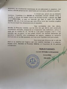 Dans la plainte, il est écrit : « A la suite de leur plainte déposée en date du 17 juillet 2023, l’office du Procureur de la République du Parquet de Grande instance de Kinshasa/Gombe a ouvert un dossier judiciaire sous RMP37.311/PRO21/BAS dont les enquêtes diligentées auraient conclu au SUICIDE de la victime suivant les résultats communiqués à la presse en date du 29 février 2024, par le Procureur Général près la Cour de cassation ».