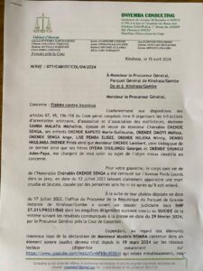 Madame Samba Malata Micheline, épouse et veuve de Monsieur Chérubin Okende, ses enfants, père biologique ainsi que ses frères, ont chargé le cabinet Onyemba Consulting, sis, aux croisements des avenues 24 novembre et Ngele dans la commune de Lingwala de porter plainte contre inconnus, ce lundi, 15 avril 2024.