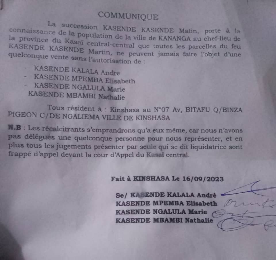 Dans un communiqué signé depuis Kinshasa, le 16 septembre dernier, des membres de la famille feu Martin KASENDE KASENDE alias « Kas Kas » informe l’opinion qu’aucune vente de leurs parcelles dans la ville de Kananga, au Kasaï Central, ne peut se faire sans l’autorisation de Kasende Kalala André, Kasende Mpemba Élisabeth, Kasenge Ngalula Marie et Kasende Mbambi Nathalie, tous résidents à Kinshasa.