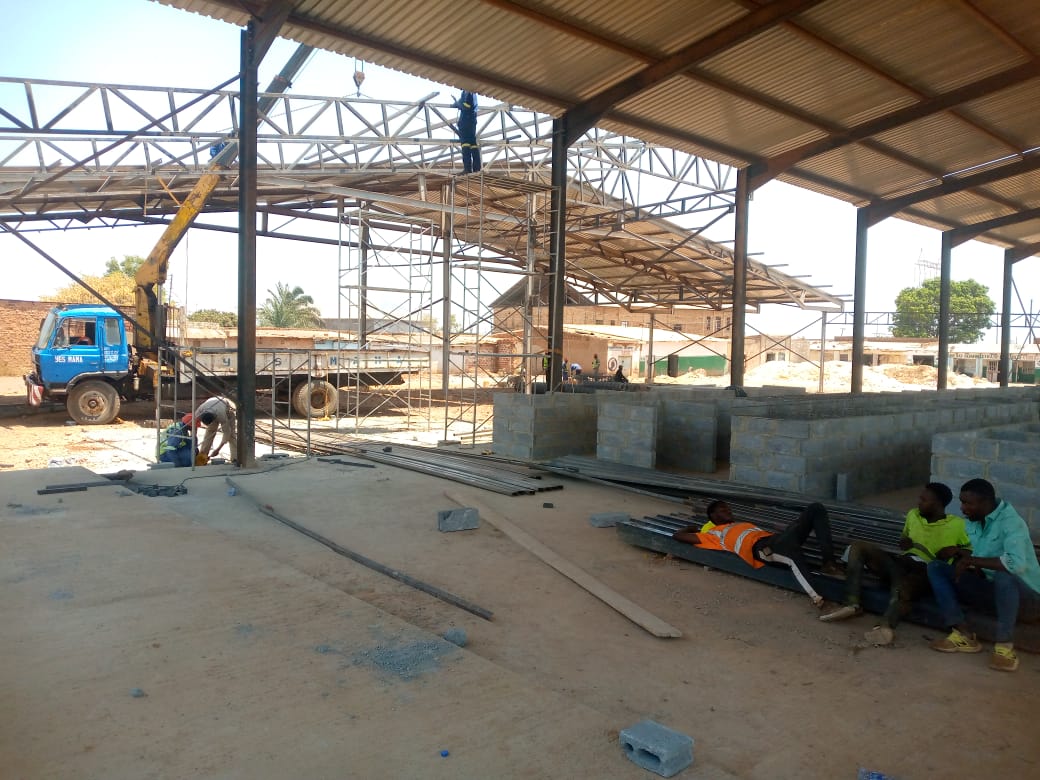 Pour l’instant, les travaux de la toiture sont presque finis, et les étalages. L’heure est à la construction des différents bureaux et les installations hygiéniques.