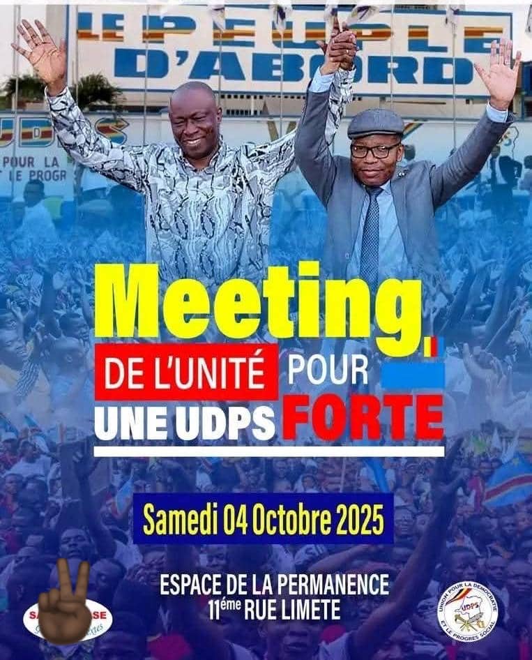 C’est désormais officiel : Augustin Kabuya, Secrétaire Général et Président a.i. de l’UDPS, et Deo Buzibu, Secrétaire adjoint du parti, tiendront ensemble un meeting ce samedi 4 octobre 2025 à l’esplanade de la permanence de l’UDPS, située à la 10ᵉ Rue Limete, Kinshasa.
