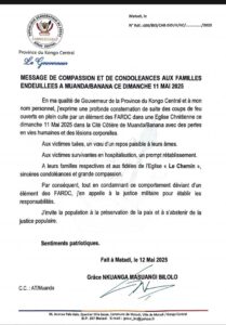 Dans son message de compassion et de condoléances aux familles endeuillées, daté du 12 mai 2025, le gouverneur de province, Grâce Nkuanga Masuangi Bilolo, condamne ce qu’il qualifie de « comportement déviant » de l’homme en uniforme, et appelle la justice militaire à établir les responsabilités.