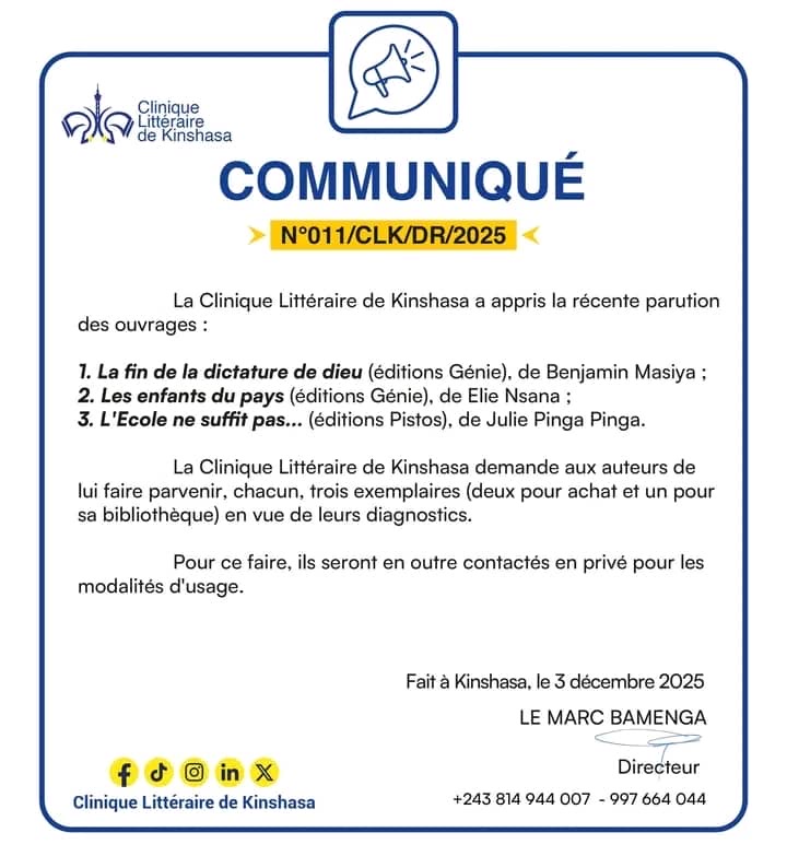 Dans un communiqué de presse rendu public et relayé ce vendredi 5 décembre par le média en ligne Congoprofond.net, la Clinique Littéraire de Kinshasa (CLK) a annoncé la parution de trois nouveaux ouvrages signés par des auteurs congolais. Fidèle à sa vocation d’analyse et de critique littéraire, l’institution entend soumettre ces publications à une évaluation rigoureuse, conformément à sa tradition de valorisation des œuvres nationales.