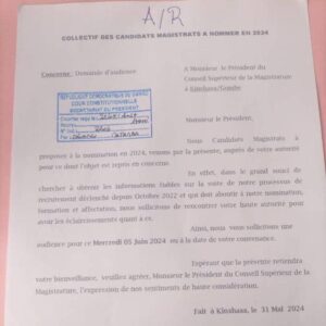 Ayant introduit leur demande d’audience auprès du Bureau du Président du Conseil Supérieur de la Magistrature et Président en fonction de la Cour Constitutionnelle ( une copie parvenue à la rédaction de Congoprofond.net) depuis le 31 Mai 2024 sans succès.