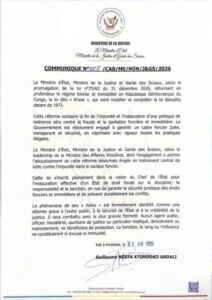 Le ministère de la Justice salue la promulgation de la loi n°25/62 du 31 décembre 2025, dite « loi N’Sele », qui réforme en profondeur le régime foncier et immobilier en République démocratique du Congo.