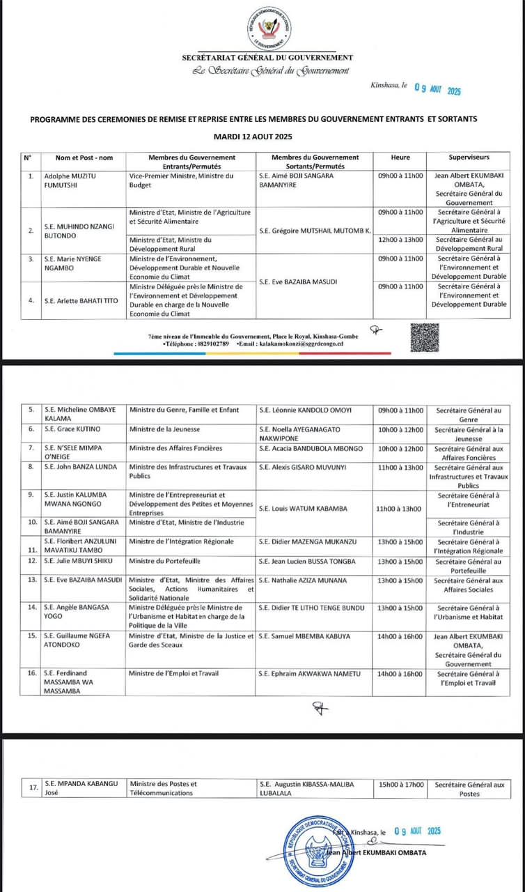 Le Secrétariat général du Gouvernement de la RDC a publié le calendrier officiel des cérémonies de remise et reprise entre les membres du Gouvernement Suminwa II et leurs prédécesseurs, prévues ce mardi 12 août 2025 à Kinshasa.