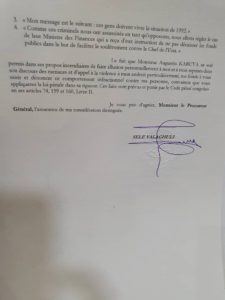 “Le fait que monsieur Augustin Kabuya se soit permis dans ses propos incendiaires de faire allusion, personnellement à moi et à trois reprises dans son discours, à des menaces et appel à la violence à mon endroit particulièrement, me fonde à vous saisir et dénoncer ce comportement infractionnel contre ma personne, convaincu que vous appliquerez la loi pénale dans sa rigueur. Ces faits sont prévus et punis par le code pénal congolais en ses articles 74,159 et 160, livre II”, peut-on lire dans cette plainte.