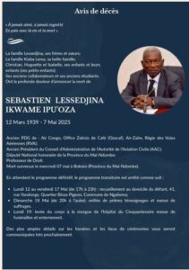 Le 7 mai 2025, à Bokoro, en province du Mai-Ndombe, s’est éteint l’un des piliers de l’administration publique congolaise : Sébastien Lessedjina Ikwame Ipu’oza, à l’âge de 86 ans. Ancien PDG de compagnies stratégiques comme Air Congo, l’Ozacaf, Air-Zaïre ou encore la Régie des Voies Aériennes (RVA), ancien président du Conseil d’administration de l’Autorité de l’Aviation Civile, député national honoraire, professeur de droit et formateur de plusieurs générations de cadres, le disparu laisse une empreinte profonde dans l’histoire institutionnelle du pays.