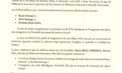 Le Ministère de l’Éducation nationale et Nouvelle Citoyenneté a annoncé la publication des résultats de l’Examen d’État (EXETAT) 2025 ce dimanche 3 août, pour plusieurs provinces...